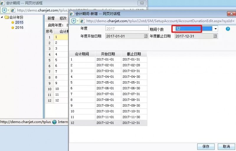 4.点击新增后在弹出的以下截图中,期间数选择为“12”,检查无误后直接点击确定即可(